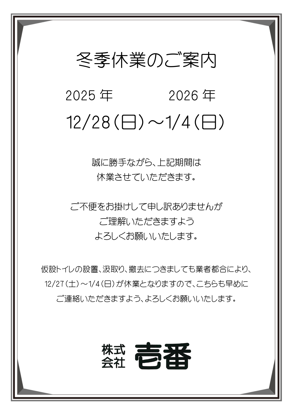 お世話になっております。 株式会社壱番の冬季休業のご案内をします。 2025年12月28(日)〜2026年1月4日(日) 誠に勝手ながら、上記期間は休業させていただきます。 ご理解いただきますようよろしくお願いいたします。 記事のタイトルとURLをコピーする Post Share Hatena Pocket RSS feedly Pin it 2025年度GW(ゴールデンウィーク)休業のご案内 前の記事